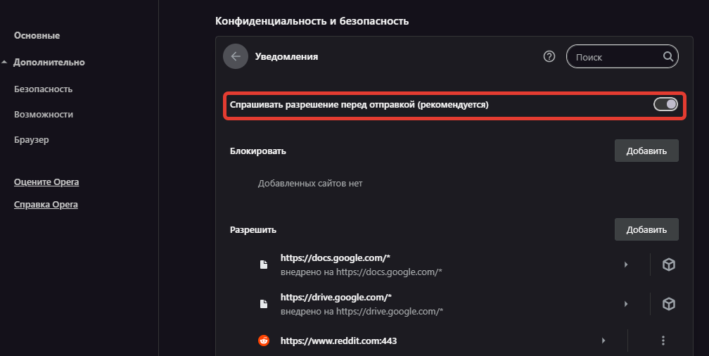 Глобальный список разрешений (и блокировок) хранится в настройках Opera GX. К нему удобно обращаться, когда нужно выполнить массовую блокировку или наоборот добавить отдельные страницы в список исключений.