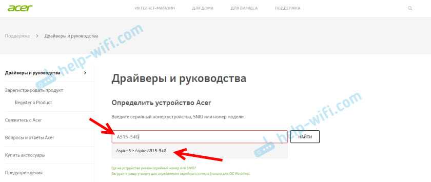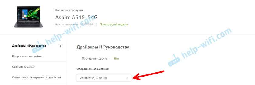 Например, ноутбук Acer модель Aspire 5 A515-54G. Заходим на сайт Acer и ищем свою модель (обычно в разделе «Поддержка», «Загрузки»).