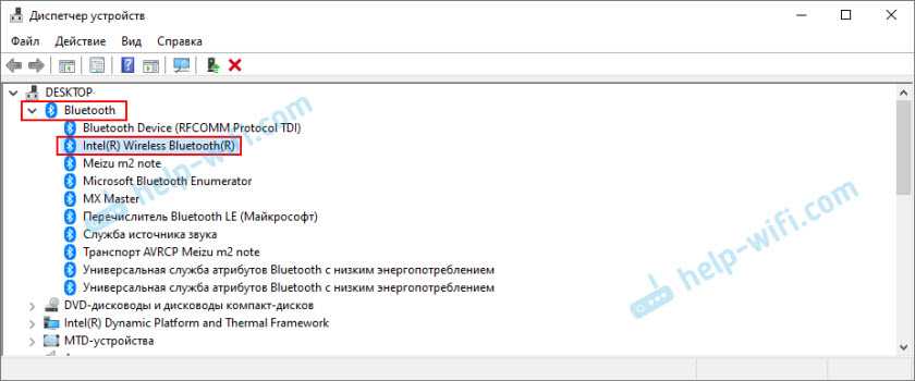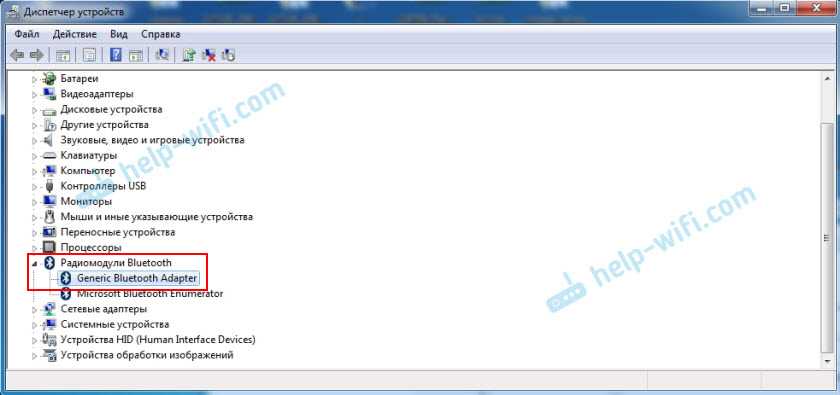 Там должна быть вкладка «Bluetooth», или «Радиомодули Bluetooth». В этом разделе должен быть Bluetooth адаптер. В зависимости от модели и установленного драйвера имя может быть разным. В Windows 10: