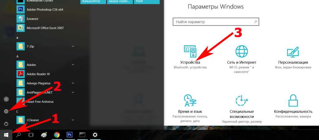 Входим в «Пуск», «Параметры», «Устройства».