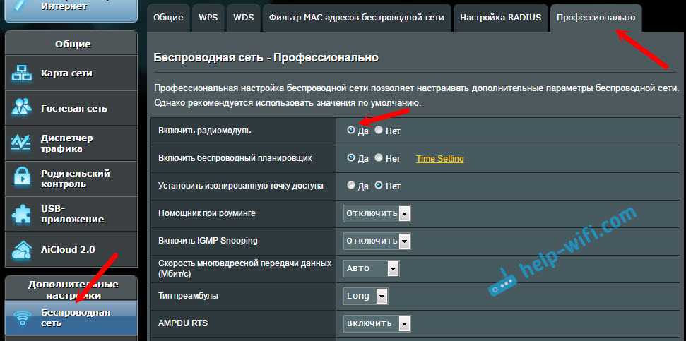 Обратите внимание, что должна быть установлена галочка возле пункта «Enable Wireless Router Radio» (Включить беспроводное вещание). На маршрутизаторах ASUS