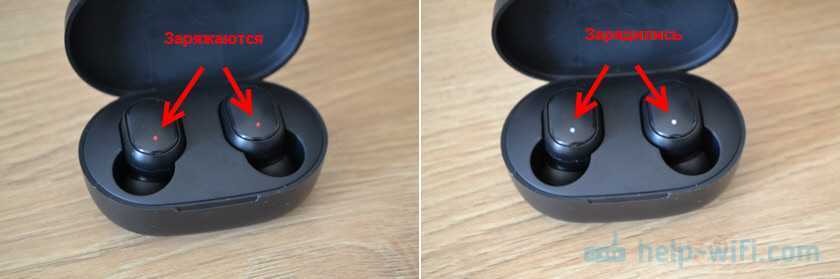 Чтобы зарядить наушники Xiaomi Earbuds или Redmi AirDots нужно просто поместить их в чехол. Они сразу начнут заряжаться. В процессе зарядки индикатор на каждом наушнике горит красным цветом. Когда они полностью зарядились он начинает гореть белым цветом.