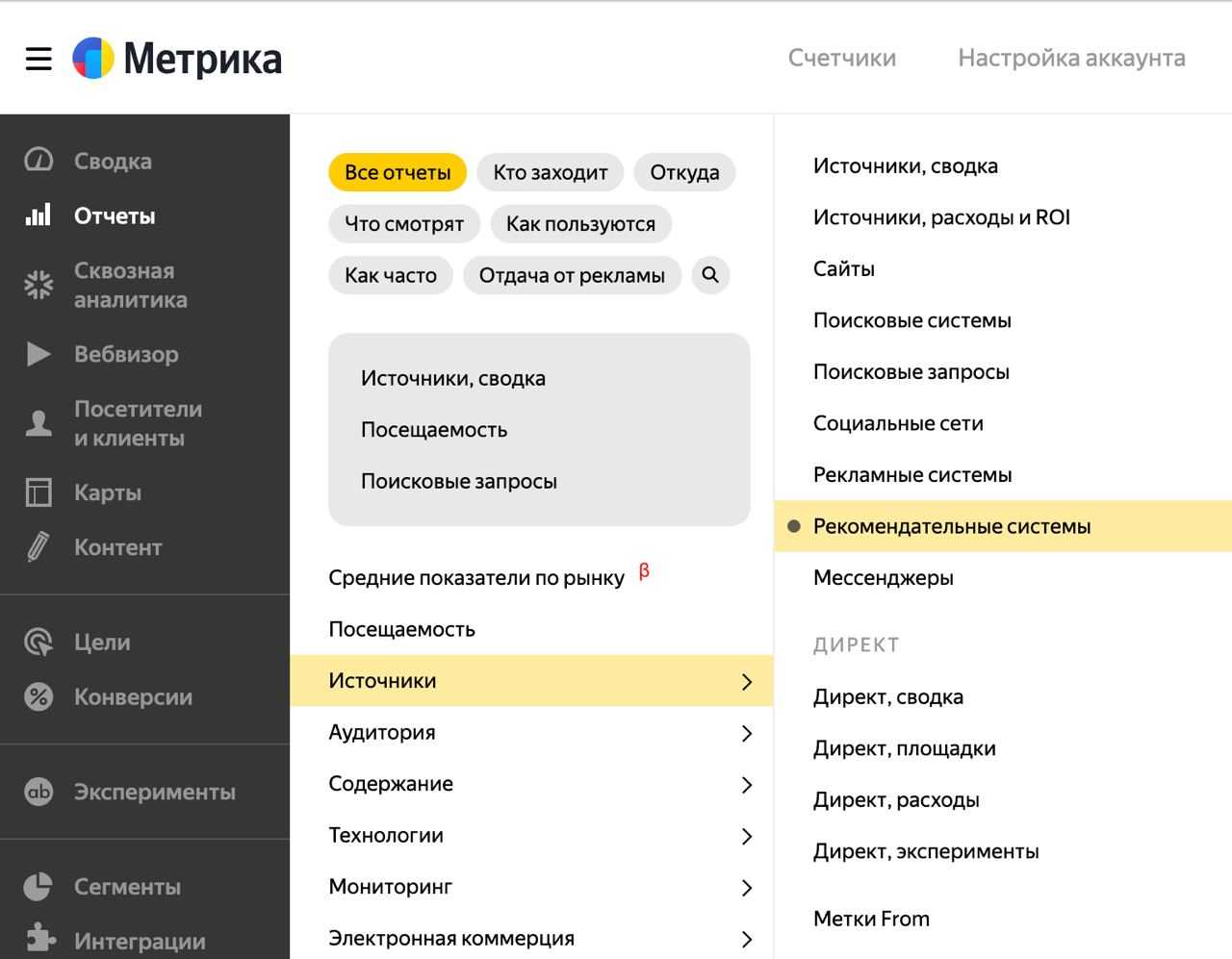 Раздел «Рекомендательные системы» в Яндекс МетрикеДалее следует выбрать источник, переходы из которого вы хотите просмотреть: