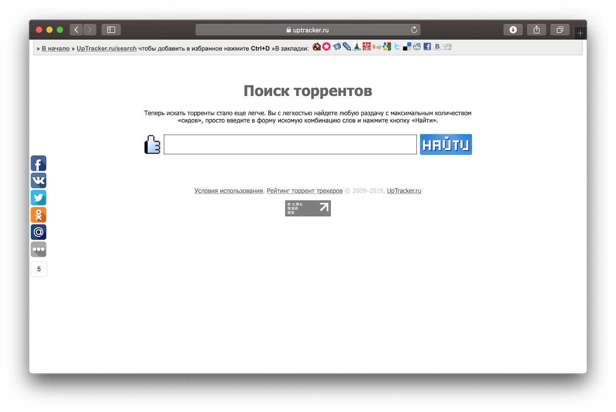 Сайт встречает нас светлым дизайном и сразу без лишних предисловий указывает на свой поисковик, расположенный крупным планом по центру. Слева присутствует вертикальная графа с социальными сетями для возможности поделиться торрент поисковиком. Сверху над поиском присутствует информация для добавления сайта в закладки и кнопка на главную сайта Uptracker. Под поисковой графой можно найти условия использования, рейтинг торрент-трекеров, дату основания и ссылку на главную сайта.