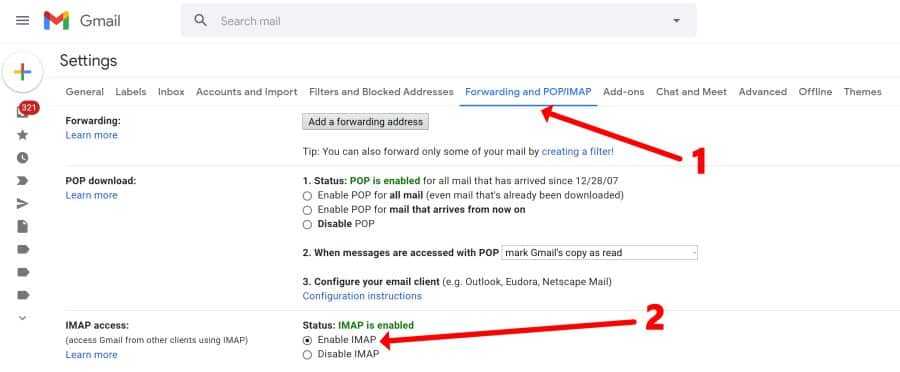 Откройте Gmail Параметры, переключить на Пересылка и POP / IMAP вкладку и включите IMAP, как показано ниже.: