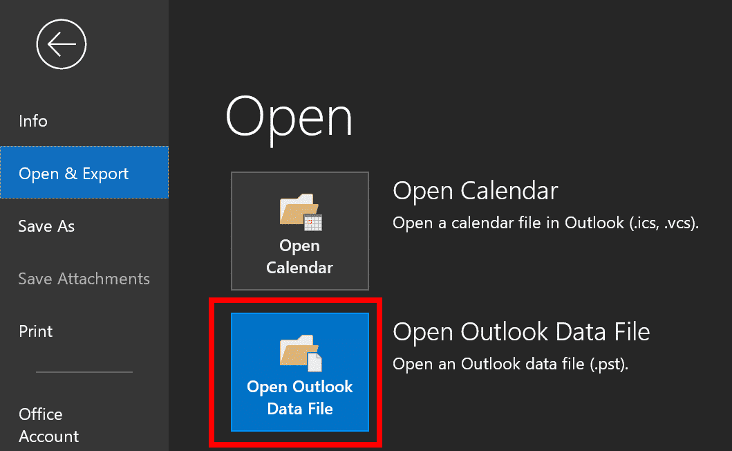 По умолчанию программа пытается загрузить полученный PST файл данных в Microsoft Outlook сразу после преобразования почты Windows. Для этого требуется опция программы “Открыть файл PST в Outlook (когда закончите)” быть включенным. В качестве альтернативы вы можете открыть файл PST вручную., для этого нажмите открыть Outlook, и используйте меню Файл > Открыто & Экспорт > Откройте Outlook файла данных: