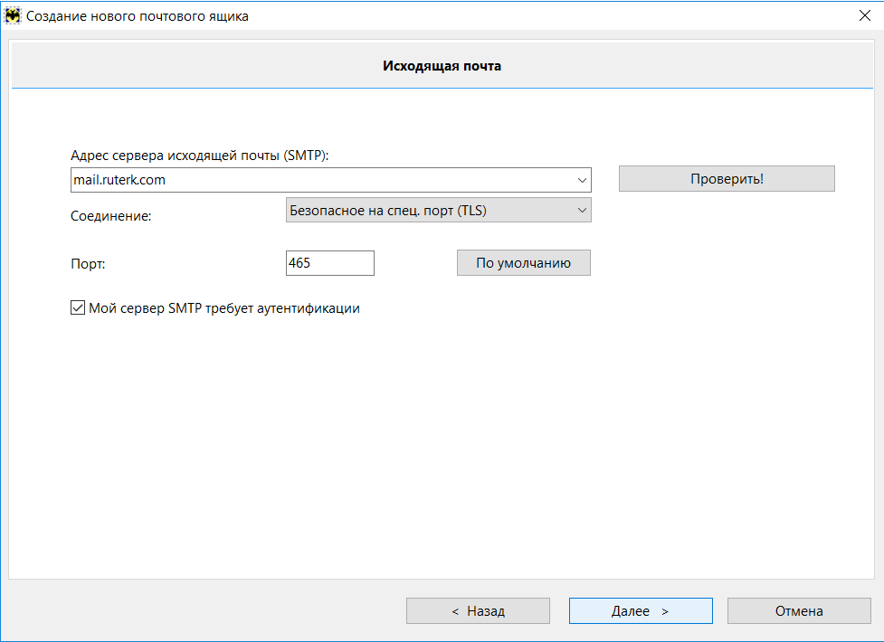 В окне «Исходящая почта» необходимо ввести нужные от вашего почтового ящика, если не знаете то оставьте всё по умолчанию, а для продолжения нажмите «Далее».
