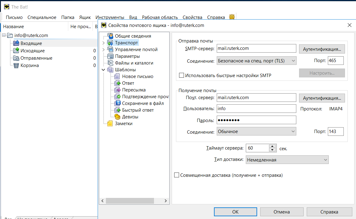 В окне The Bat откройте вкладку «Транспорт» и задайте настройки для серверов почты: