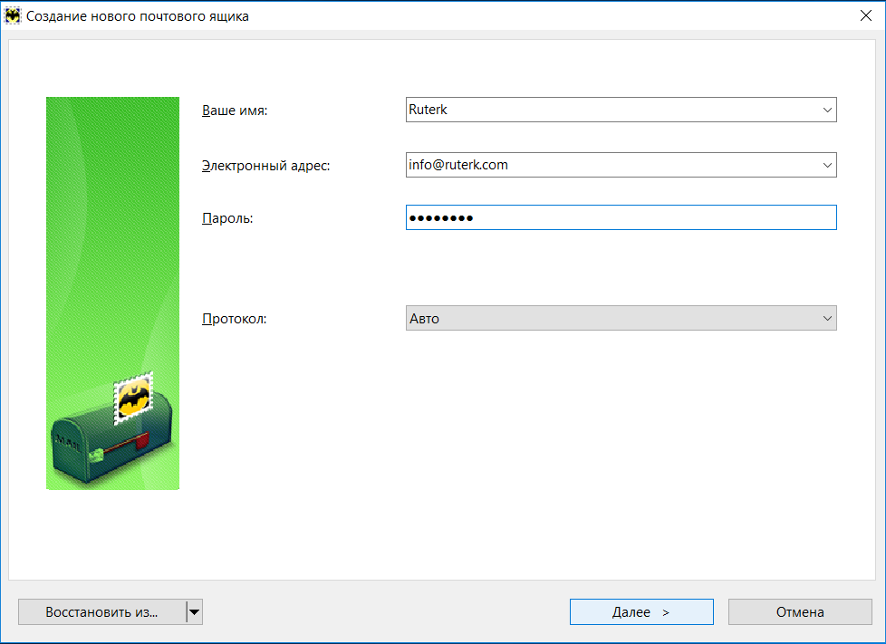 Наступает самый ответственный момент настройки программы. Вам необходимо создать новый почтовый ящик для этого, введите данные от заранее зарегистрированного почтового ящика и нажмите кнопку «Далее».