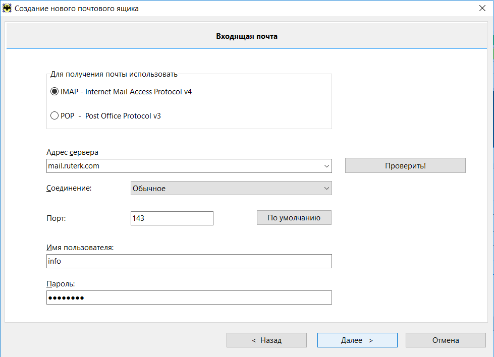 | Тип подключения | Выберите тип подключения к почтовому серверу (POP3 или IMAP) |