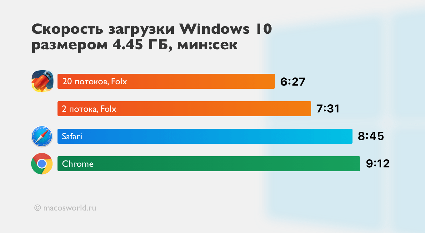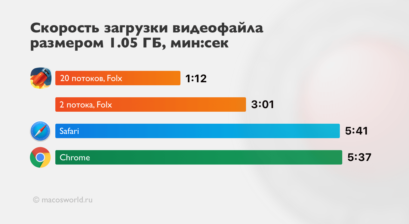 Как видите, даже в 2 потока Folx качает ощутимо быстрее, чем стандартные загрузчики Safari и Chrome. В 20 потоков — вообще красота.