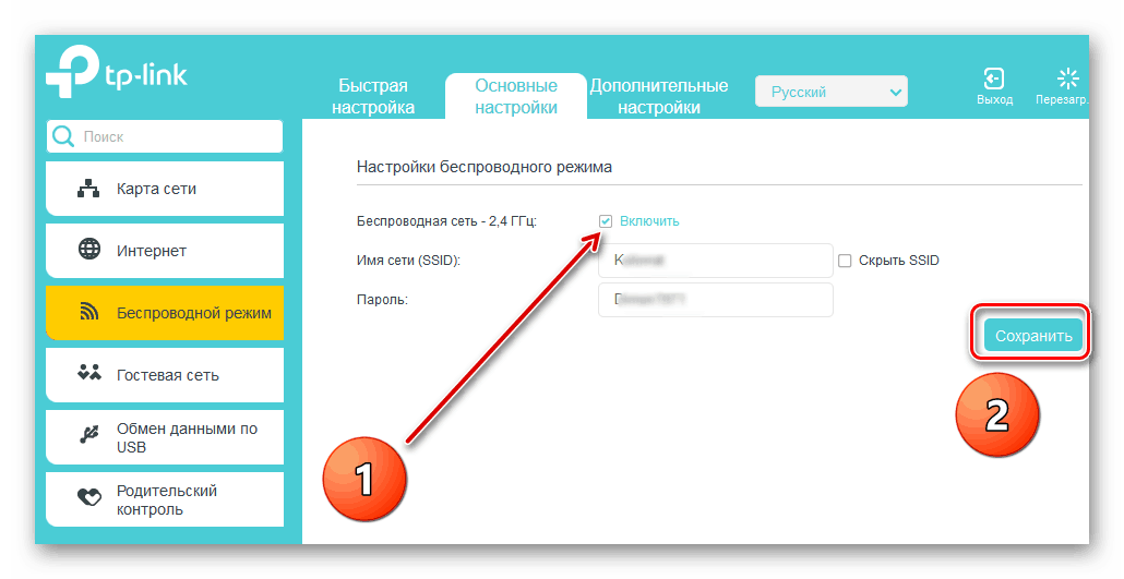 Возможен вариант, когда вы или кто-либо другой, имеющий доступ к конфигурации роутера, по ошибке отключили раздачу беспроводного сигнала или эти параметры слетели. Значит, нужно попасть в веб-интерфейс маршрутизатора и задействовать столь необходимую нам функцию. Последовательность манипуляций для этого похожи на различных сетевых устройствах с небольшими отличиями названий параметров и интерфейса. Для наглядного примера возьмем роутер фирмы TP-Link.