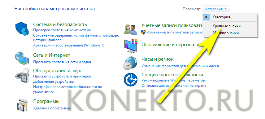 В открывшемся окне переключается с «Категорий» на «Значки».