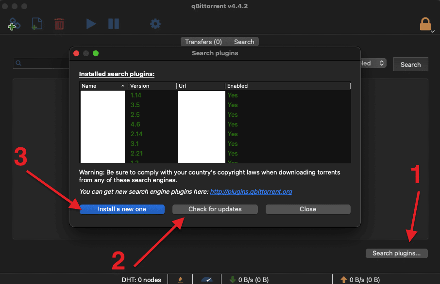 - После того, как вы нажмете на “Проверить обновления”, вы увидите список поисковых плагинов – обычно индексы популярных общедоступных торрент-сайтов. Если вы ищете и скачиваете торренты через общественный торрент-трекер, рекомендуется использовать VPN..