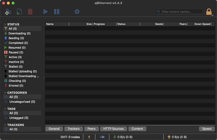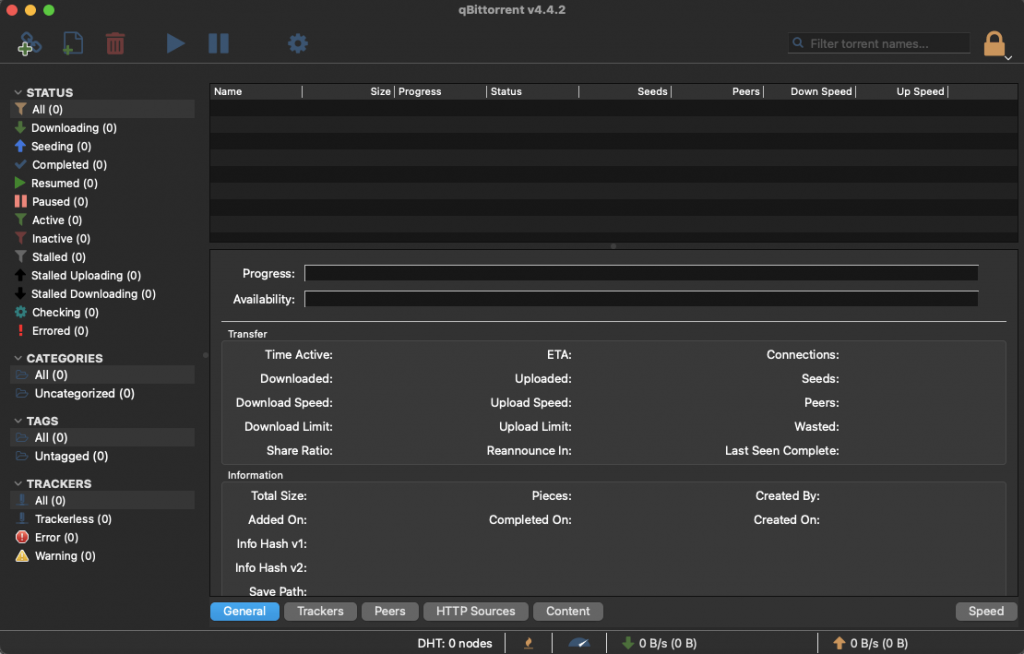 Пользовательский веб-интерфейс разделен на левую часть меню, состоящую из важных данных о статусе торрента по категориям, тэгам и трекерам, нижнюю часть меню, которая представляет собой необходимые действия для торрента, такие как “Добавить торрент-ссылку” (или магнет-ссылки), добавить торрент-файл, удалить, возобновить, приостановить и настройки. Нижняя панель показывает информацию о конкретном торренте. Вы можете получить сведения о здоровье торрента, включая прогресс, доступность, трекеры, пиры, источники HTTP, контент и скорость.