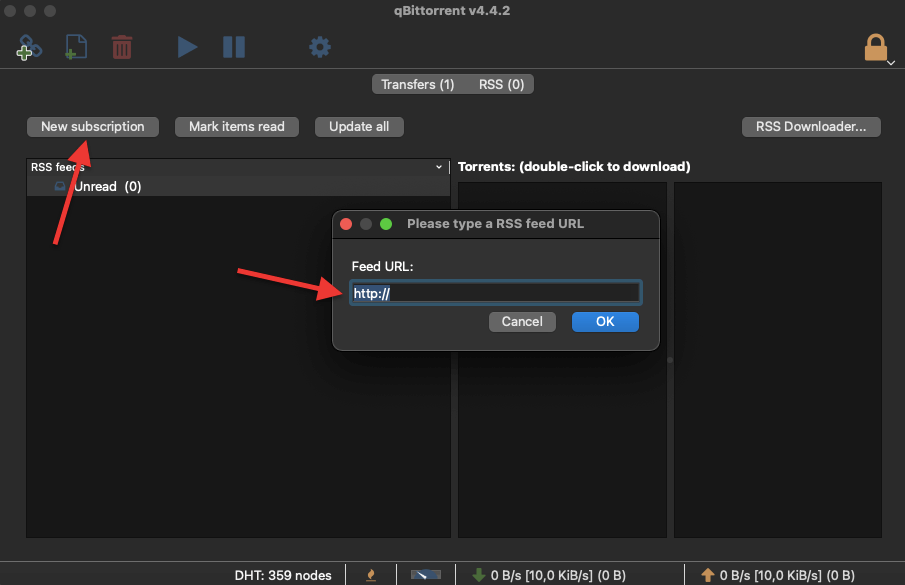 - Снова откройте свой RSS-ридер в qBittorrent > нажмите на “Новая подписка” > Введите URL ленты RSS в поле. Нажмите ОК.