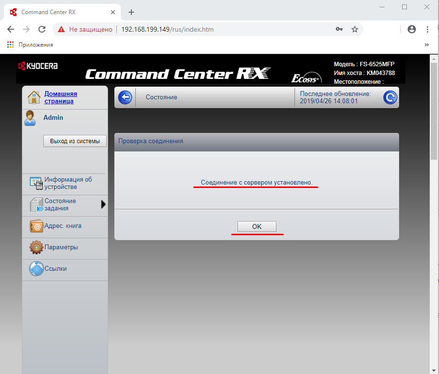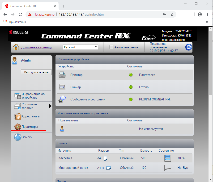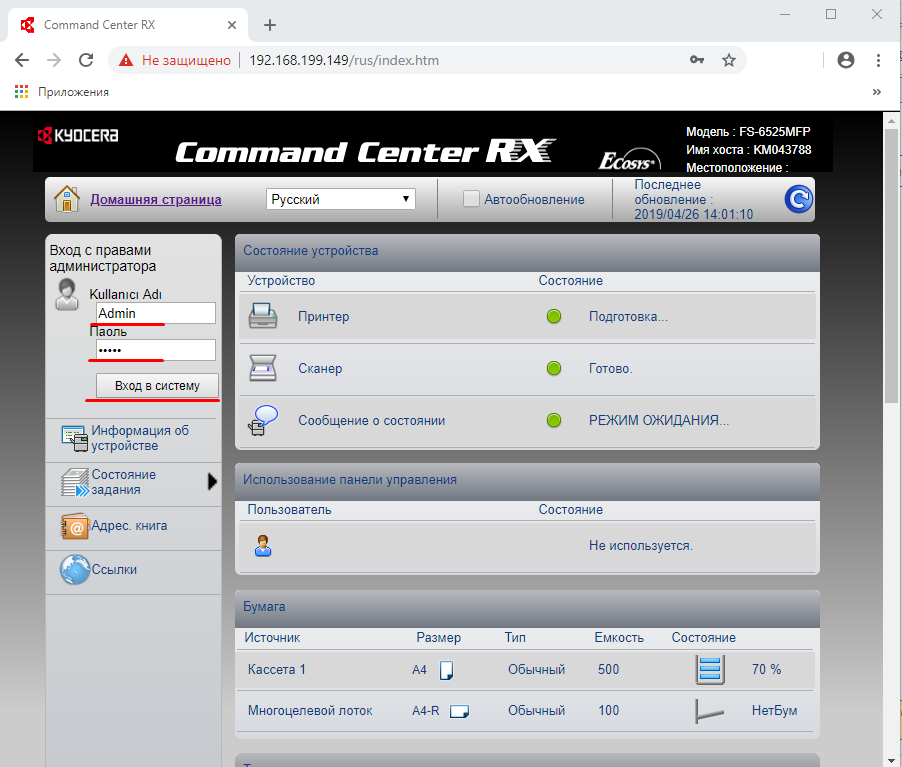 Настроить сканирование в сетевую папку можно двумя способами с самого аппарата или по сети. Второй вариант намного удобней по этому будем использовать именно его. Первое что вам нужно сделать это узнать IP адрес вашего устройства. Его можно распечатать с самого МФУ если зайти в настройки. Дальше открываем браузер и вводим IP. После чего откроется домашняя страница.