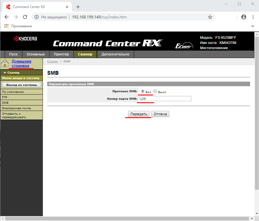 Переходим на вкладку «Сканер» и слева в списке выбираем пункт «SMB». Проверяем включен ли данный сетевой протокол и указан ли порт. Если все включено то переходим обратно кликаем «Домашняя страница».
