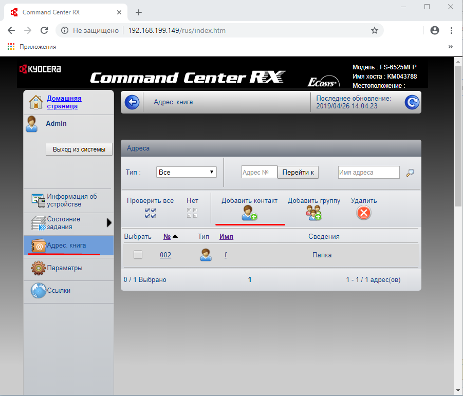 1) Открываем веб-браузер и вводим в адресную строку присвоенный раннее ip-адрес мфу.2) При открытии Kyocera command center нам необходимо зайти в систему и ввести пароль ( В предыдущей статье мы рассмотрели как зайти в веб-интерфейс Kyocera) в нашем случае пароль — admin003) В верхнем меню переходим во вкладку «Основные», далее в левом меню выбираем раздел «Адресная книга» — «Контакты».4) В открывшемся разделе нажимаем «добавить контакт».5) Заполняем поле «Имя» контакта — которое будет отображаться на мфу.6) Заполняем поле «Имя хоста» — вводится либо имя компьютера либо его ip-адрес, на который будут сканироваться документы.7) Заполняем поле «путь» — путь к папке в которую будут отправляться отсканированные документы. Заполняем поле «Имя пользователя для регистрации» — имя пользователя для входа в компьютер или домен.9) Заполняем поле «Пароль для регистрации» — пароль от имени пользователя для входа в компьютер или домен . 10) Нажимаем клавишу «передать».