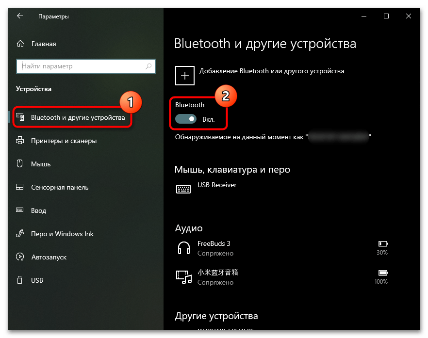 Для установки соединения убедитесь, что на компьютере и телефоне включены адаптеры Bluetooth. На Windows 10 эта опция включается в приложении «Параметры» — «Устройства», на смартфонах под Android — в панели быстрого доступа.