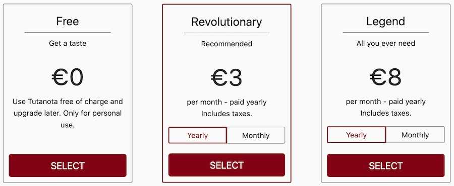 Как и почти любой другой почтовый клиент, вы получаете собственный адрес электронной почты в домене Tutanota при регистрации учетной записи. Но, как и ProtonMail, Tutanota предлагает пользователям на выбор несколько ценовых уровней, начиная с общей суммы 0 долларов в месяц и постепенно повышаясь.
