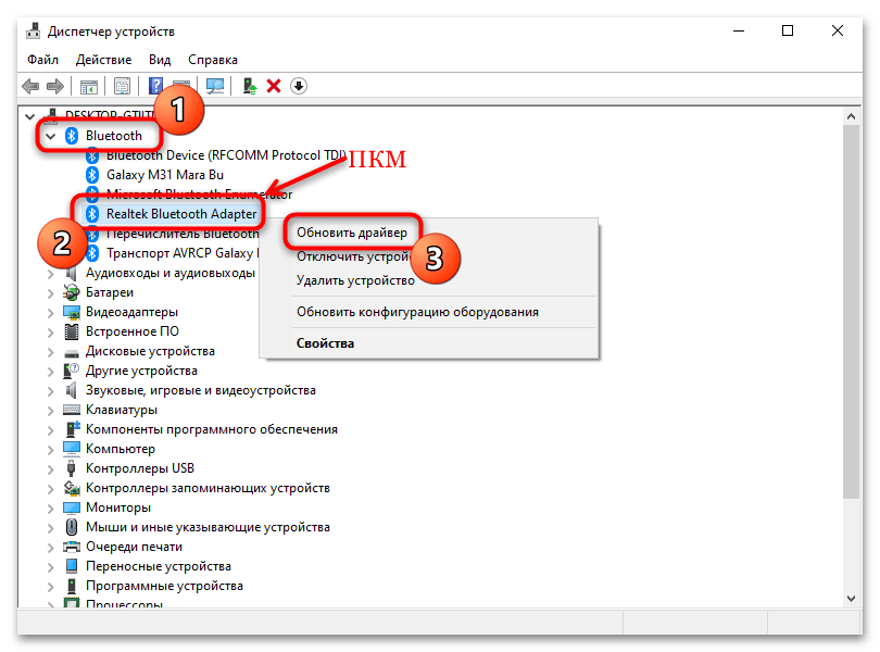 Если гарнитура появилась в списке устройств после нажатия кнопки, нажмите по имени модели ПКМ и выберите «Обновить…». Попробуйте переподключить к компьютеру или ноутбуку наушники. Возможно, ваше устройство отказывается работать с разными устройствами. Это значит, что поломка может затронуть важные их части, такие как аккумулятор. Или из строя вышел сам динамик.