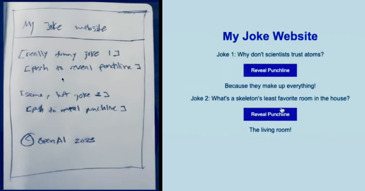 Набросок макета сайта (слева), по которому GPT-4 выдала код сайта (справа). Кадр из презентации GPT-4Кадр: OpenAI / YouTube