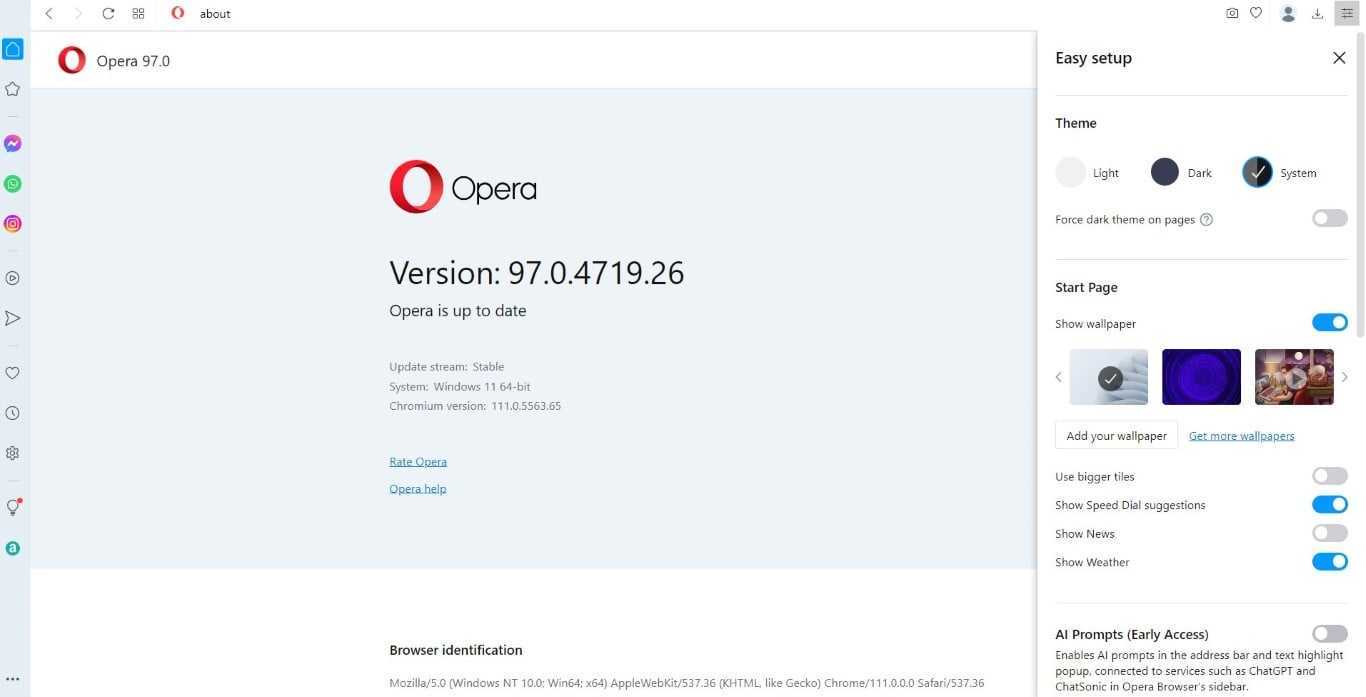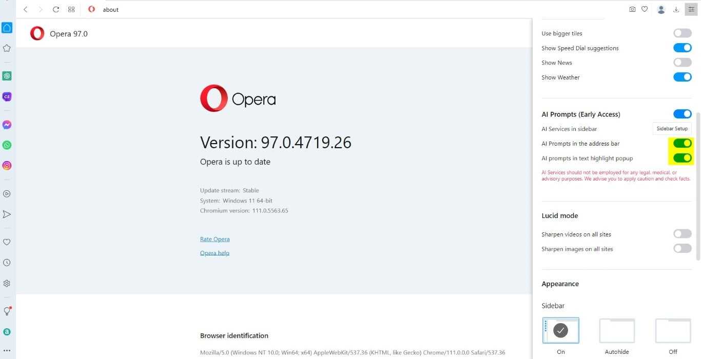 2: Activate Early Access Option Once you have upgraded or downloaded the Opera browser. Then, go to Easy Setup and activate the Early Access option by toggling “AI Prompts.” Toggle AI Prompts in the address bar and AI prompts in the text highlight popup. This will enable AI Prompts in the browser UI and AI services in the sidebar.