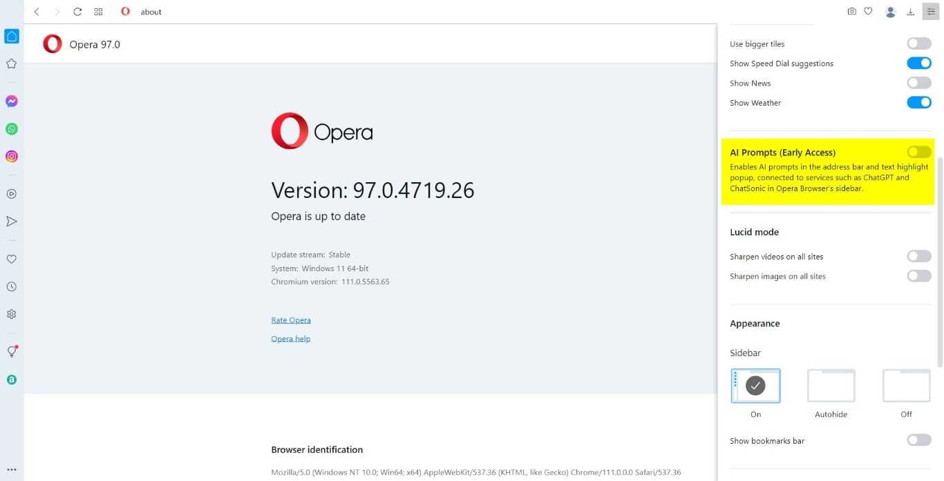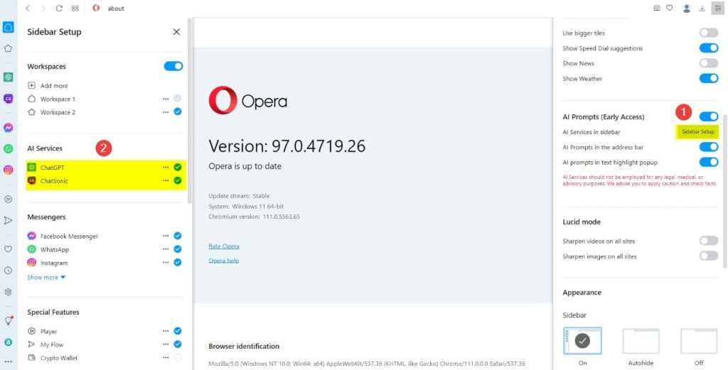 1: Upgrade or Download Opera Browser to access the AI Prompts feature and enable ChatGPT in Opera Sidebar. The AI Prompts feature is available in early access in Opera (Win, Mac, and Linux) and Opera GX (Win and Mac).
