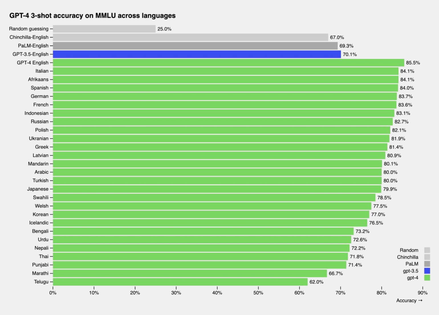 GPT-4 отвечает на вопросы на иностранных языках (включая редкие) лучше, чем модели GPT-3.5, PaLM и Chinchilla AI на английскомИзображение: OpenAI