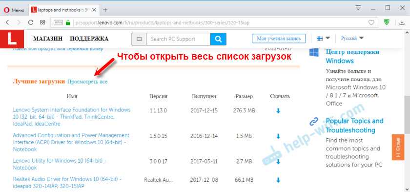 Откроется страничка нашего устройства. Нас интересуют загрузки. Там сразу будут предложены «Лучшие загрузки» среди которых уже можно найти нужный драйвер, или утилиту. Но если нажать на «Просмотреть все», то откроется полный список с сортировкой по разделам.