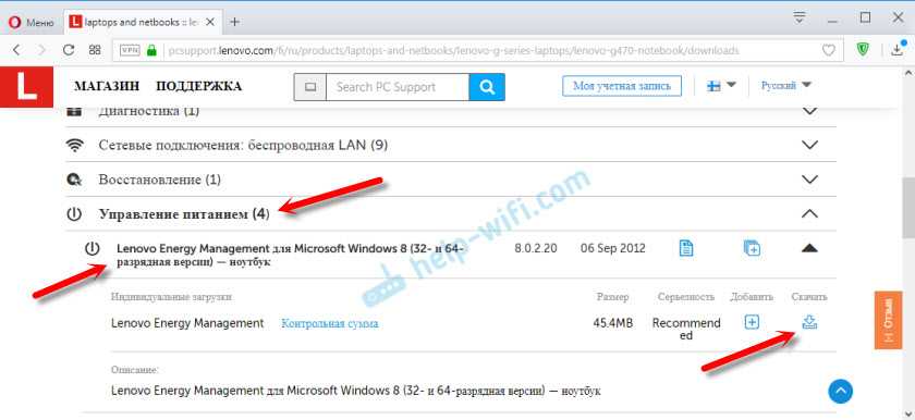 А утилиту Lenovo Energy Management можно найти и скачать в разделе «Управление питанием».