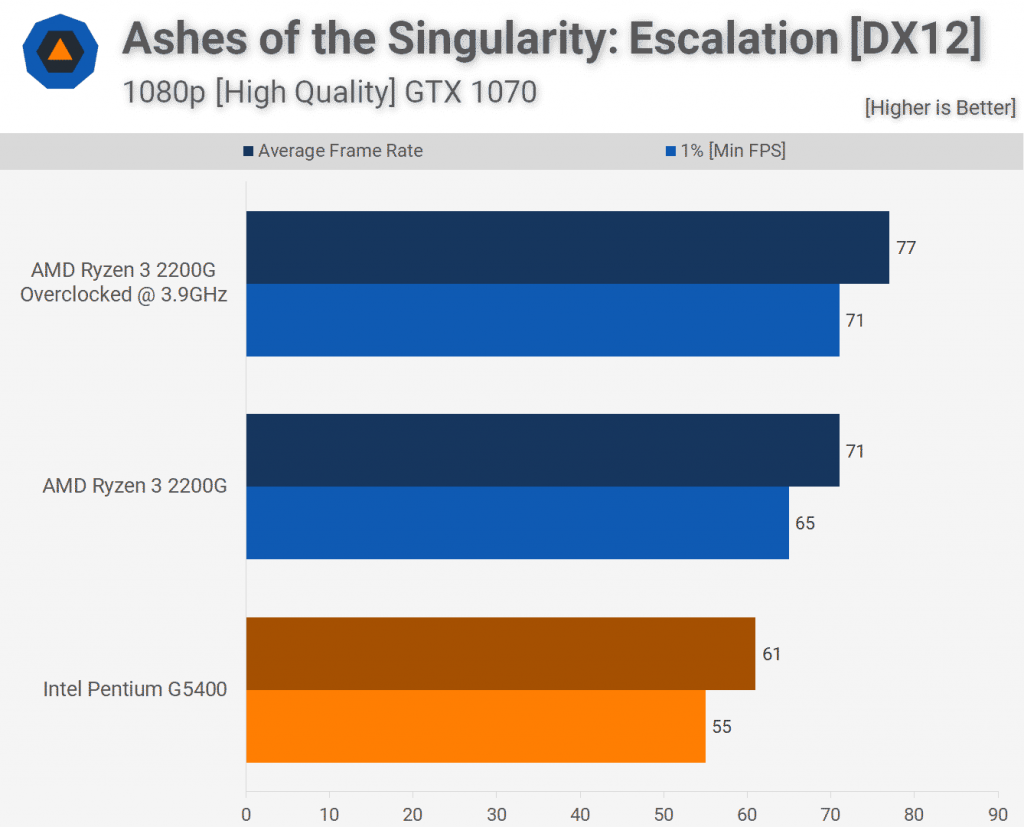 Я тестировал девять наименований в целом, и мы собираемся начать с результатов Ashes of Singularity, всеобщего любимого синтетического игрового теста. Эта игра сильно использует процессор, и здесь мы видим, что 2200G предлагает на 18% больше производительности, чем G5400, и почти на 30% больше раз разогнанных — это некоторые огромные выгоды от GTX 1070.
