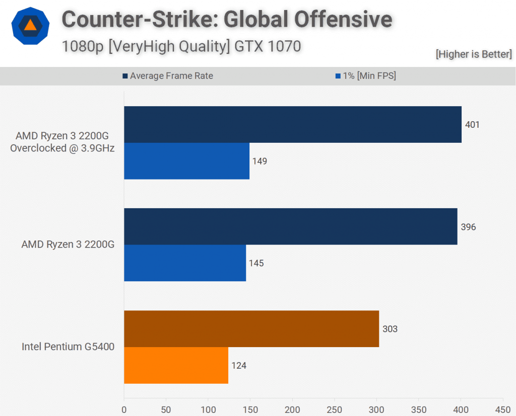 Counter-Strike Global Offensive — это не та игра, в которой я рассчитывал по-настоящему поддержать процессор Ryzen 3, но здесь мы видим, что 2200G обеспечивает на 31% больше кадров в среднем и 32% больше раз разогнан. Разгон не очень помог в этом названии, но, тем не менее, 2200G все еще значительно опережал G5400.