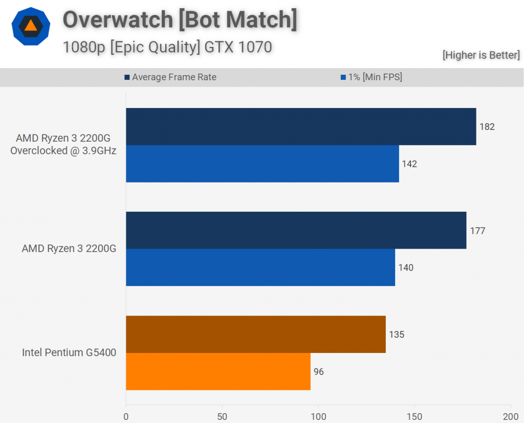 Опять же, производительность в Overwatch была твердой, используя либо процессор, но 2200G был на 45% быстрее при сравнении 1% низкой производительности.