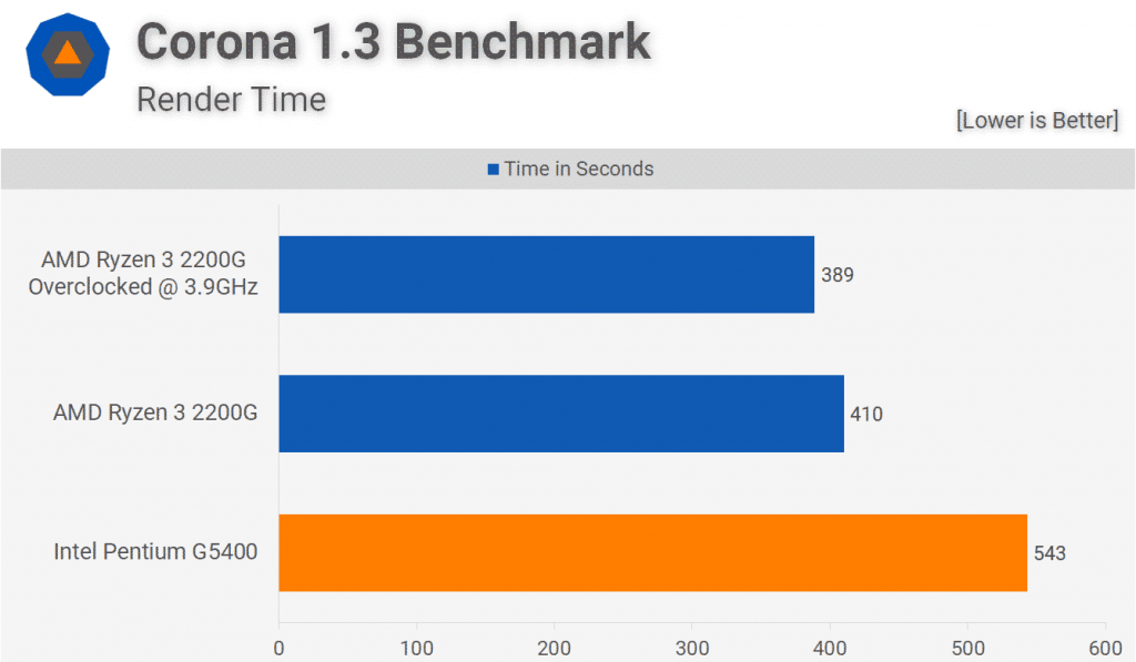 Процессор Pentium прилагает все усилия в многопоточном тестировании, так как здесь он был всего на 24% медленнее, чем 2200G при тестировании с Corona. При разгоне 2200G эта маржа была увеличена незначительно до 28%.