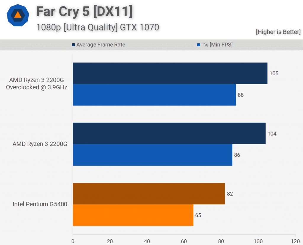 Far Cry 5 — еще одна игра, где разгон 2200G мало что сделал для процессора Ryzen. Тем не менее, он был на 30% быстрее, чем G5400, глядя на 1% -ные данные.