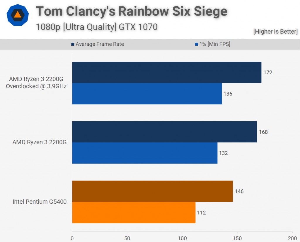 Еще одно название, которое показало, что оба графических процессора обеспечивают прочную производительность, — Rainbow Six Siege, но даже несмотря на то, что Ryzen 3 2200G продолжает свой выигрышный путь, на 15-20% превышающий производительность Pentium G5400.