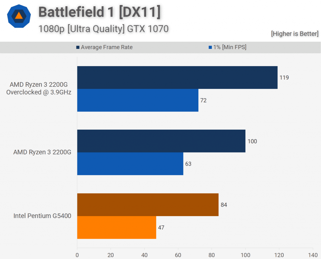 Несмотря на то, что мы можем точно измерить только одну часть Battlefield 1, мы видим, что 2200G по-прежнему хорошо используется, поскольку он обеспечивает на 34% большую производительность, чем G5400 при сравнении 1% низких результатов. Эта маржа была раздута до 53%, когда 2200G был разогнан. Следует также отметить, что игра заметно улучшилась на процессоре Ryzen 3.