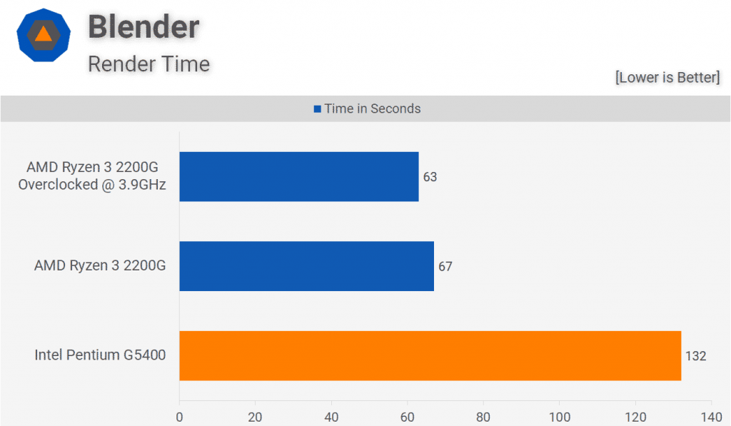 Переходя к тесту Blender, в этом реальном приложении мы видим невероятное сокращение времени рендеринга на 49% при переходе с Pentium G5400 на 2200G. Это очень похоже на то, что мы видели при просмотре многопоточной производительности с Cinebench R15.