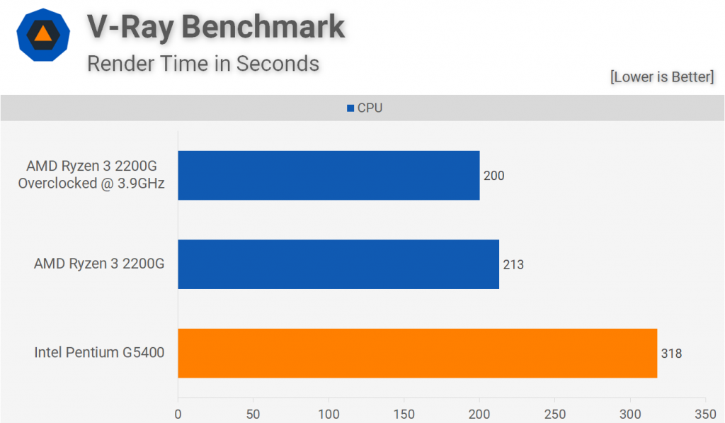 Мы видим меньшую разницу между этими двумя процессорами в тесте V-Ray, но даже несмотря на это, 2200G по-прежнему на 33% быстрее и на 37% быстрее разгоняется.
