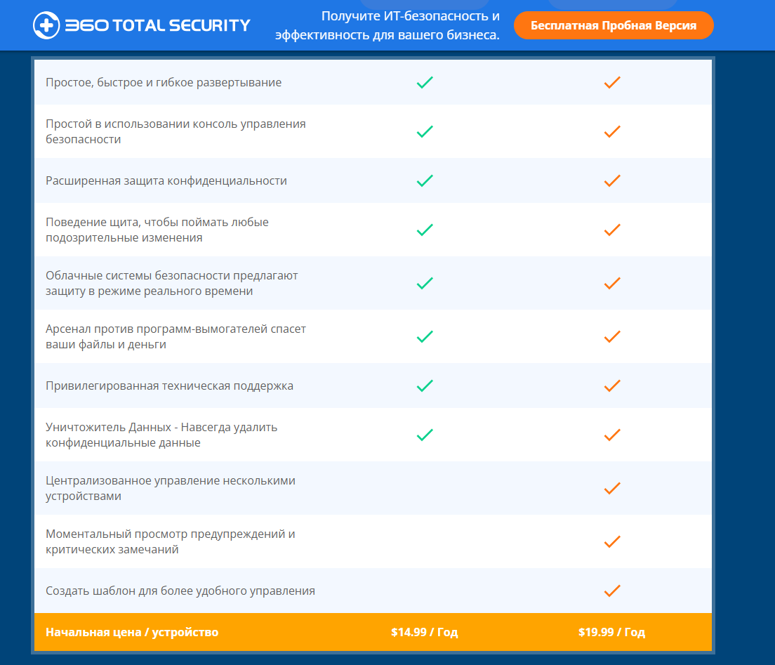 Также стоит отметить, что и бизнес-комплекты 360 Total Security предлагает дешевле, чем большинство других антивирусов. Такая подписка обойдется в 14 или 19 долларов США, в зависимости от того, какое программное обеспечение вы хотите получить.