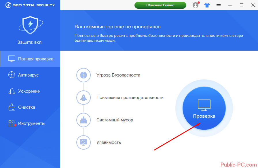 Разработчики рекомендуют сразу же запустить полную проверку на вирусы, уязвимости, просканировать и удалить системный мусор, очистить реестр, в целом увеличить производительность. В главном окне кликаем иконку «Проверка» и ждем окончания результатов.