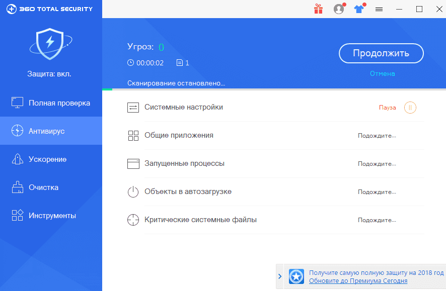 Перед тем как временно отключить антивирус 360 Total Security следует учесть, что проверка файлов, загруженных в ОЗУ, при этом не прекращается. Так что условно система всё равно будет защищена от возможного заражения, но это будет потреблять менее 0,01% ресурсов ПК (так как проверяются только новые файлы в RAM).