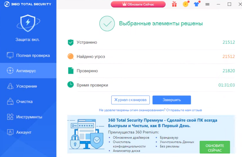 - Собственный движок антивируса 360 Total Security не обеспечивает максимальной защиты.