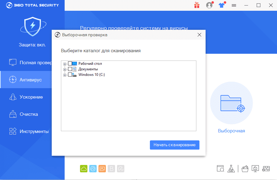 - Облачный сканер 360 Cloud — собственный облачный антивирусный движок, использующий информацию о контрольных суммах файлов. Включен всегда, отдельно не отключается.