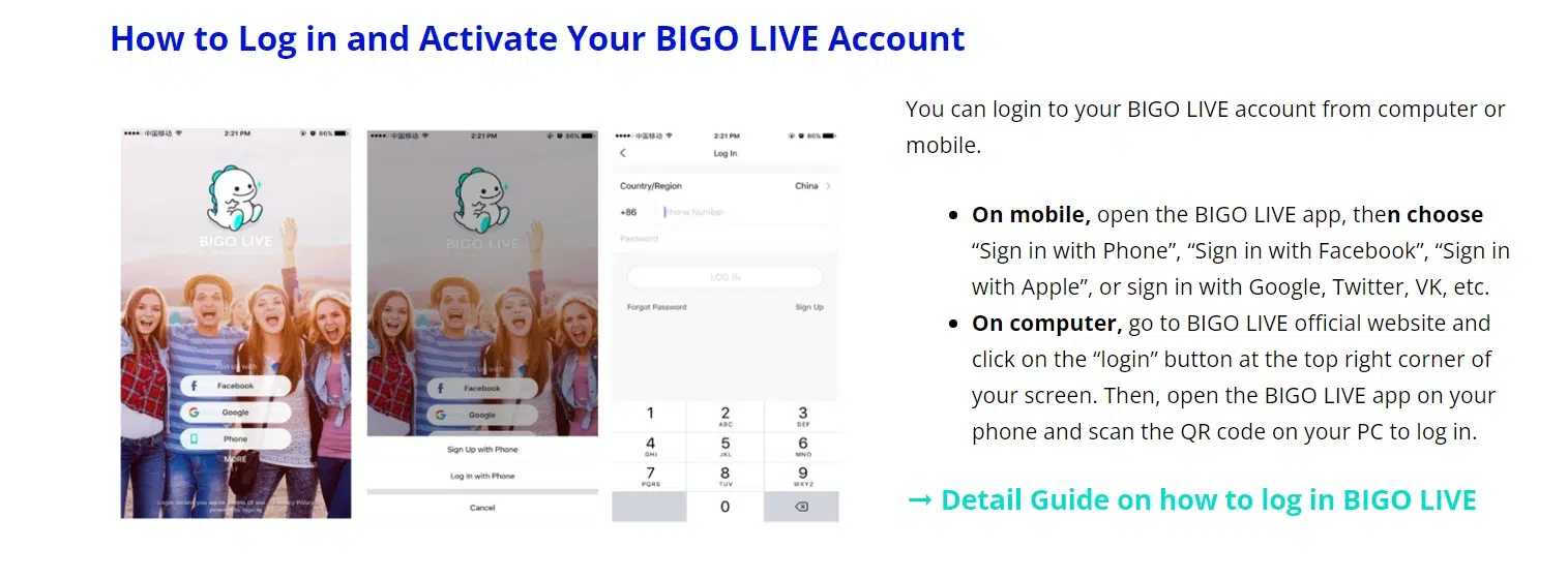 - можно привязать свой аккаунт в Bigo Live с аккаунтом в одной из соцсетей;