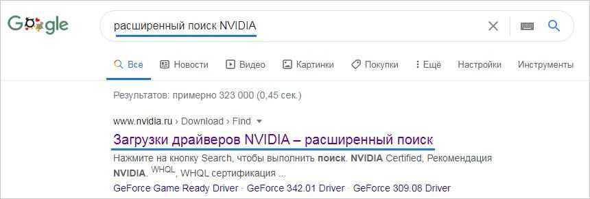 Если установлена видеокарта GeForce, наберите поисковый запрос «Расширений поиск драйверов NVIDIA» в интернете и перейдите на указанную страницу.