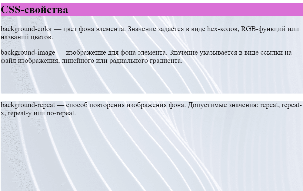 Свойство задаёт цвет фона элемента. Значение задаётся в виде hex-кодов, RGB-функций или названий цветов: