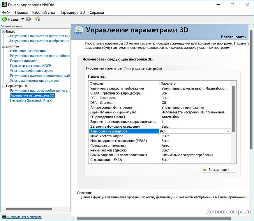 Изменить размер кэша шейдеров в панели управления NVIDIA